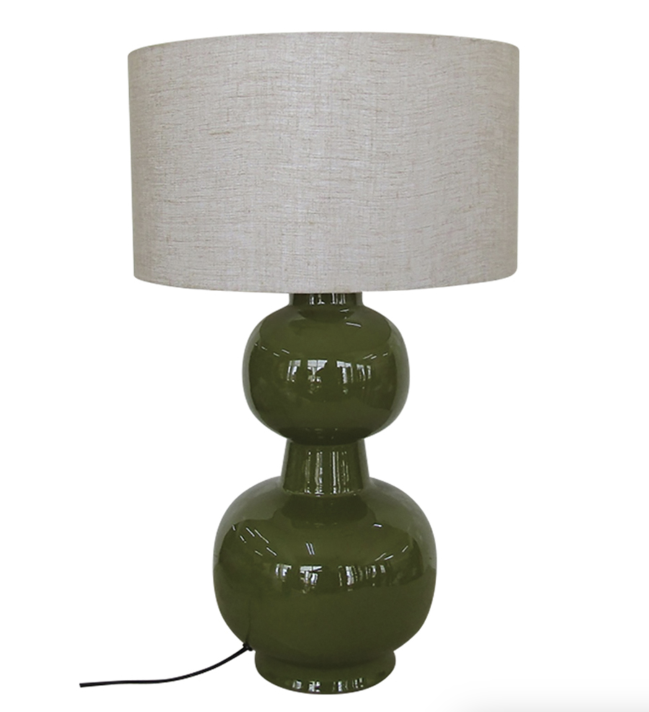 Lampe de bureau avec base en métal laquée vert et abat-jour en toile de coton.
